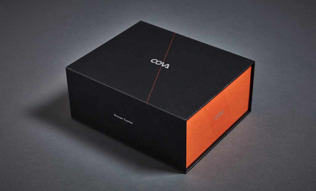 Cova invitation box, consisting of a complimentary whiskey bottle and tumbler. Specialty paper stocks have been foiled to enhance the Cova brand.